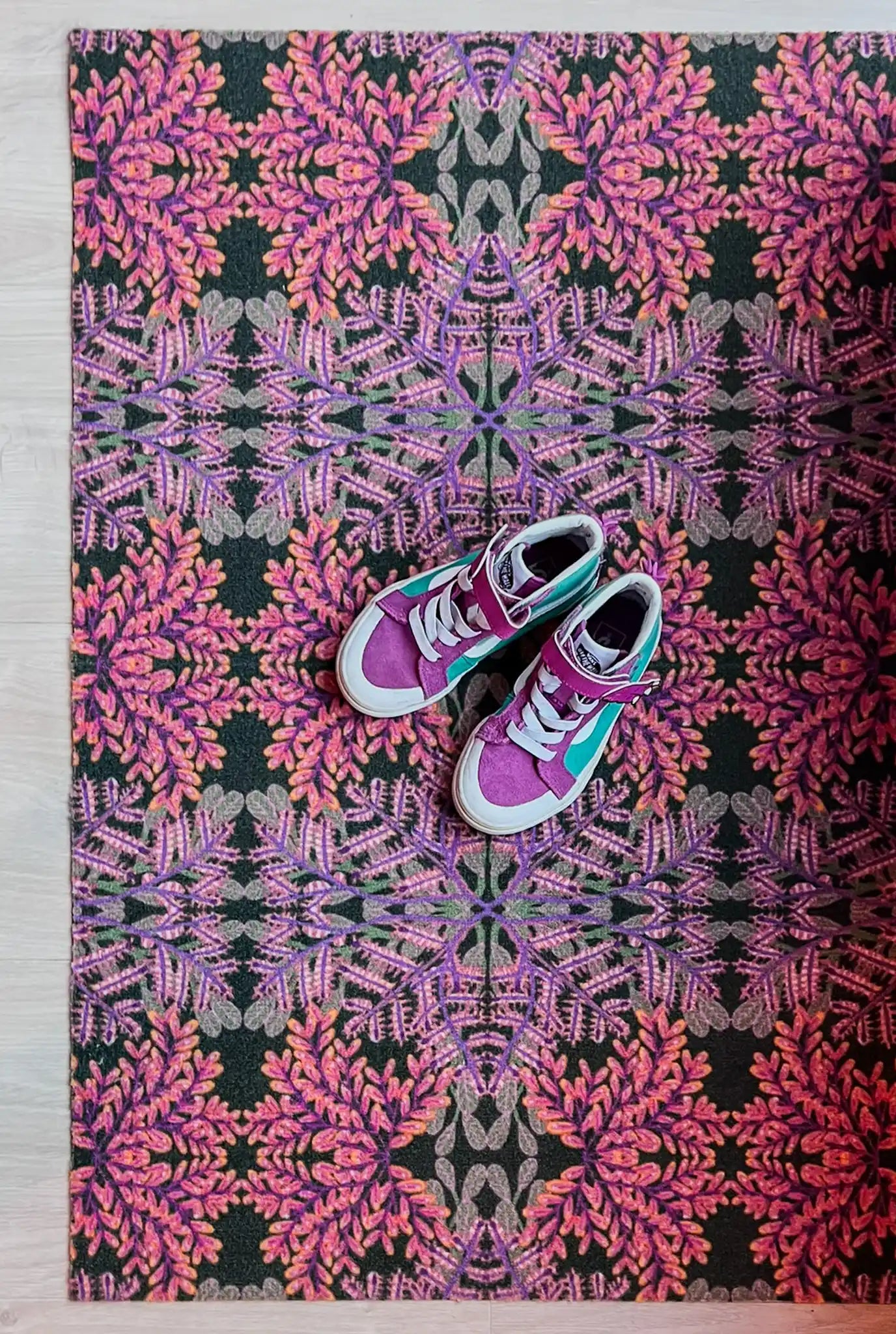 Op maat gemaakte droogloopmat Grow Your Own Way met bloemen en bladeren in groen, roze en oranje – botanische design deurmat voor binnen van Studio LilaLine